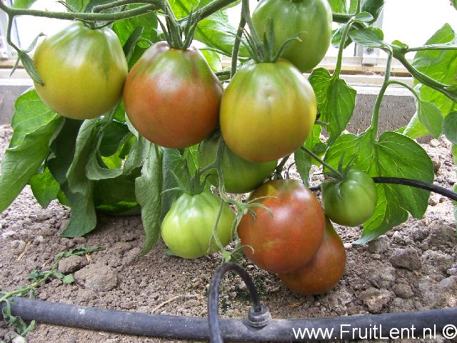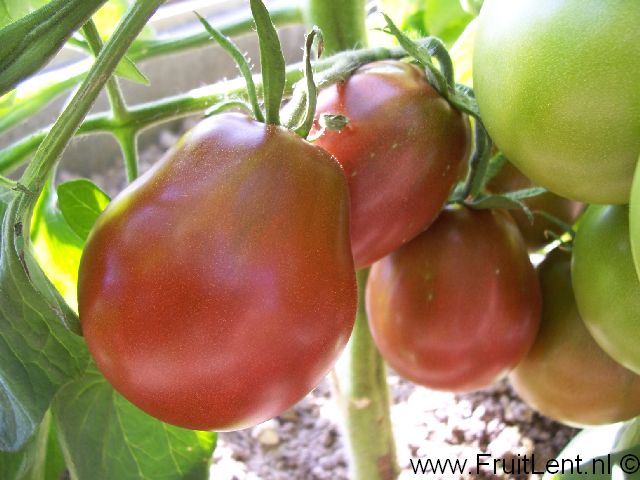 Geeft peervormige vruchten van 100 tot 140 gram met een donkerrode tot bruine kleur en een goede smaak. De eerste trossen zijn goed gezet, doch dit neemt af naarmate de plant groeit.