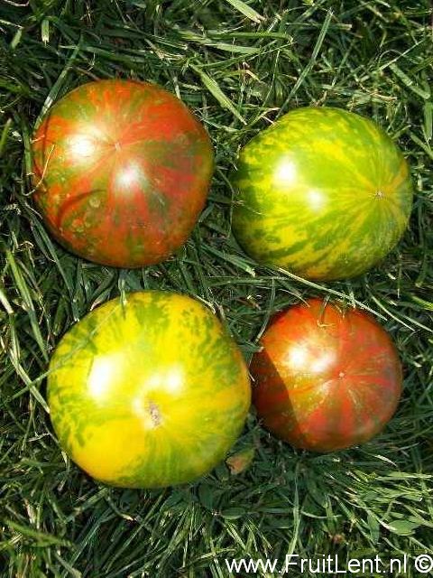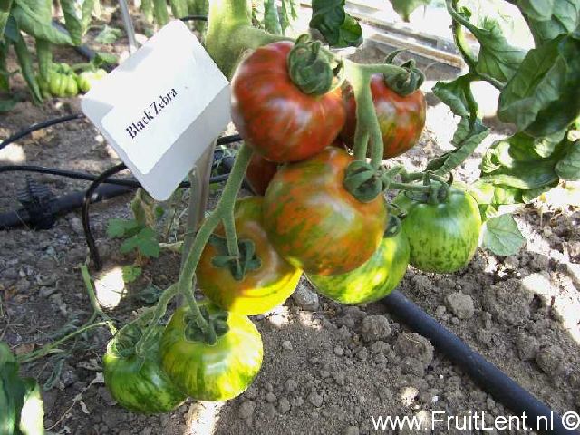 ‘Black Zebra’ lijkt veel op ‘Green Zebra’, doch de vruchten kleuren naar paarsbruin met groene strepen en het donker gekleurde vruchtvlees is iets steviger.
