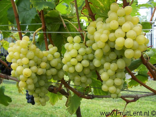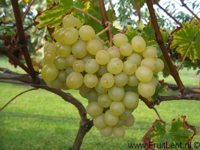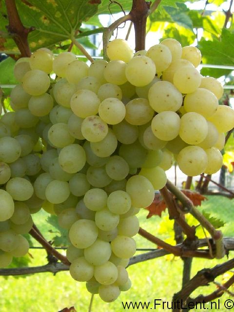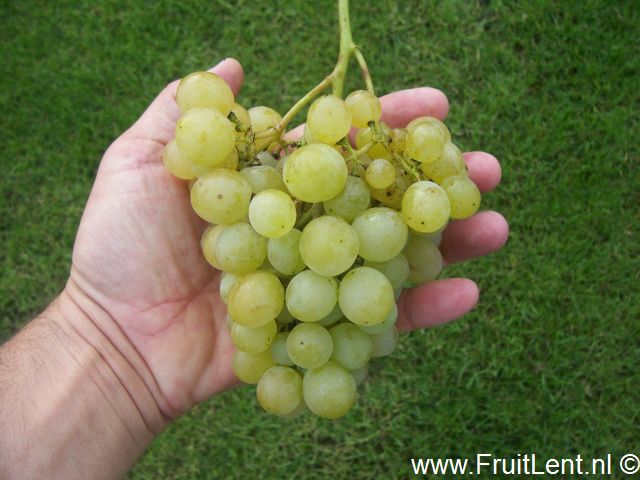 Trossen en bessen: Middelgrote tot tamelijk grote kogelvormige mat-heldergele bessen (circa 2,8 à 2,9 gram) aan middelgrote tot grote enigszins compacte trossen met een mooie vorm. Bessen die aan de zon zijn blootgesteld kleuren donkergeel. De bessen hebben tamelijk vast vruchtvlees met een stevige schil en worden aangemerkt als bijna pitloos (derhalve pitarm). Zeer aangename zoete smaak (circa 20% Brix) met muskaat-aroma. Rijpt vanaf medio september.