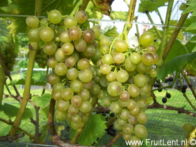 Trossen en bessen: Middelgrote breed-elliptische groengele bessen (2,0 gram) aan middelgrote wat langgerekte redelijk los tot enigszins compact gevormde trossen. Rijpt vanaf medio september. Kan in rijpe toestand lang aan de stok blijven hangen. Tamelijk stevig vruchtvlees met een goede zoete smaak (tot ruim 20% Brix) met licht muskaat­aroma. Net als bij blauwe zusterras ‘Galanth’, is het muskaat-aroma echter niet elk jaar even sterk aanwezig.