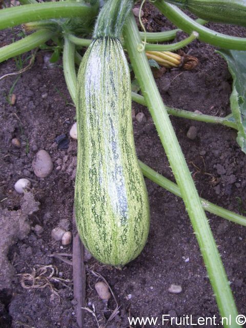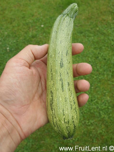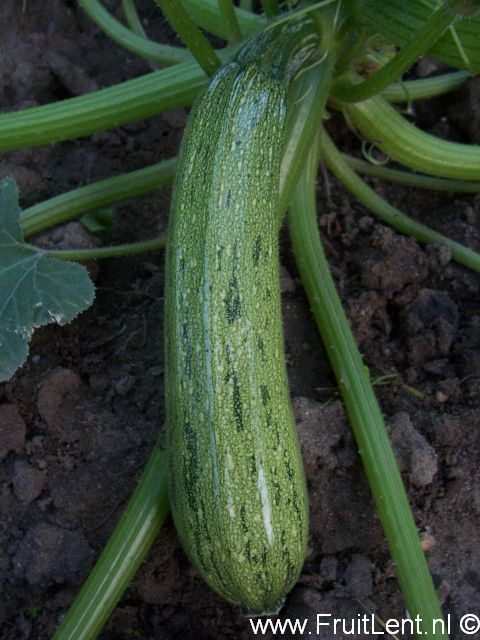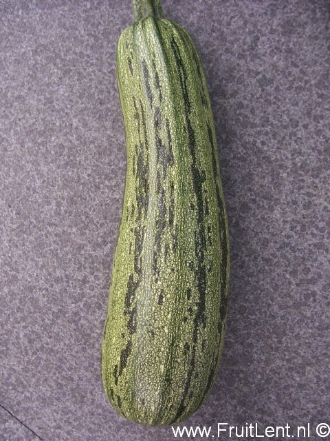Geeft langwerpige vruchten die licht geribbeld kunnen zijn. Ze zijn lichtgroen van kleur en hebben grijze stipjes en onregelmatige donkergroene strepen. Struikvormige planten met een open groeiwijze.
