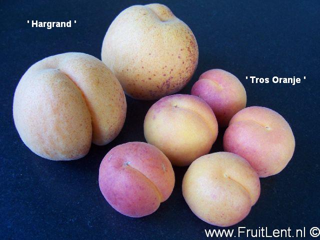 ‘Hargrand’ geeft oranje vruchten die aan de zonzijde rode spikkels hebben. De vruchten hebben een enigszins onregelmatige vorm en zijn wat variabel qua grootte, doch vrijwel alle vruchten bevinden zich tussen de 100 en 150 gram per stuk en zijn daarmee zo groot als een kleine perzik. Sommige vruchten kunnen zelfs meer dan 200 gram zwaar worden. Zelfs de kleinste vruchten van de boom bevinden zich nog tussen de 70 en 100 gram en zijn dus ook nog van behoorlijk groot formaat. Hiermee kan met recht gezegd worden dat ‘Hargrand’ enorm grote vruchten geeft. Het ras behoort dan ook tot ’s werelds grootste abrikozen !