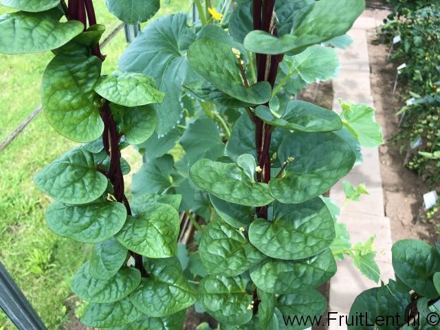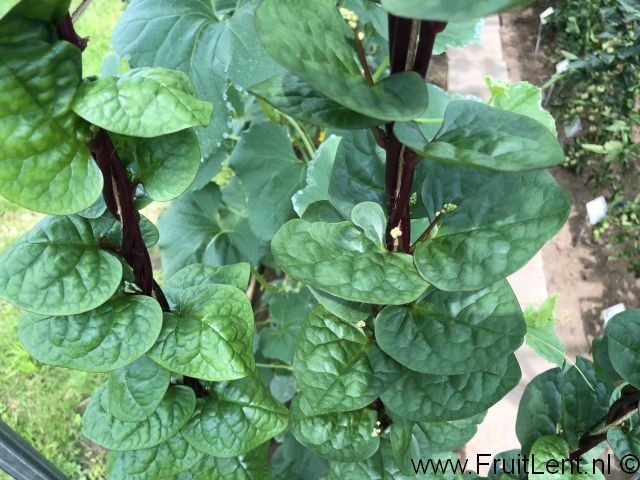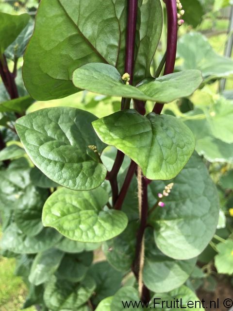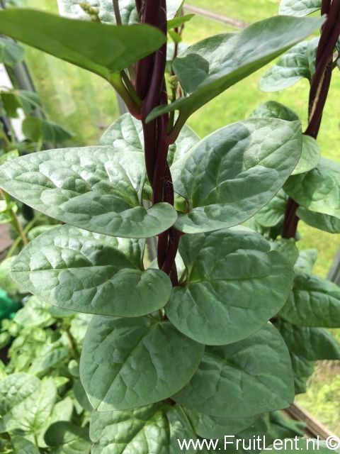 – Basella rubra: met rode stengels, rode bladstelen en groene bladeren met paarsrode verkleuring
