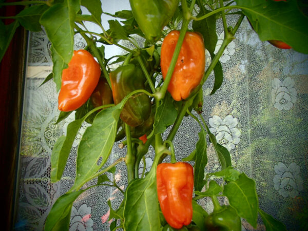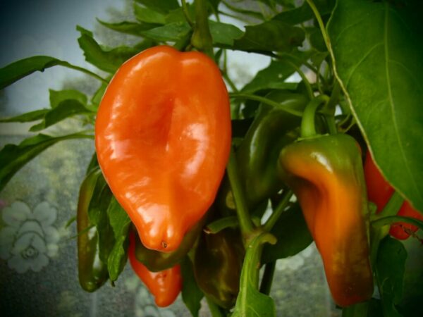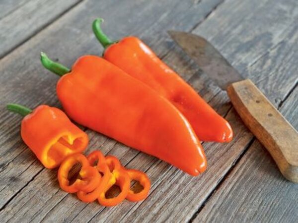 Van lichtgroen naar helderoranje verkleurende vroegrijpe puntpaprika’s met weinig pitjes.