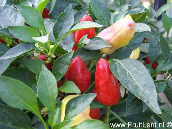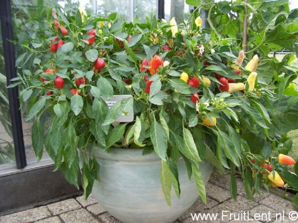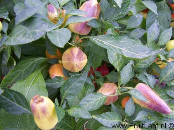 De vruchtjes zijn namelijk in het onrijpe stadium cremewit van kleur, waarbij het velletje enigszins paars kan zijn verkleurd, en rijpen vervolgens via de kleur oranje naar rood. De vruchtjes zijn zo’n 5 cm lang. Dit alles maakt dat de planten een hoge sierwaarde hebben. Ze kunnen ook goed in grote potten op het terras worden gekweekt.