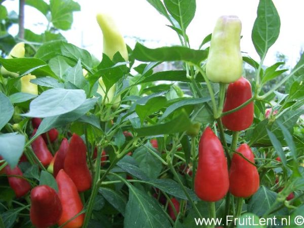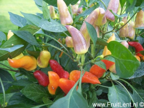 Dit ras groeit met zeer compacte planten en draagt omhoog staande kleine pepervormige vruchtjes in de kleuren rood, oranje, cremewit en paars, en dat alles tegelijkertijd aan dezelfde plant !