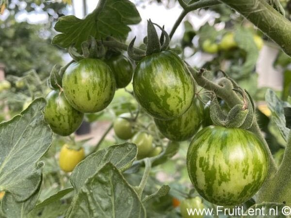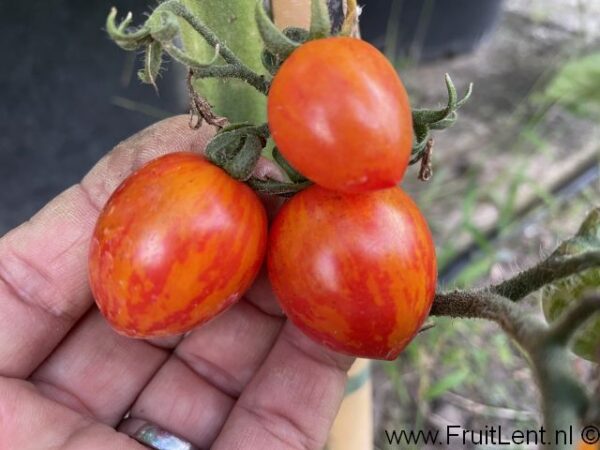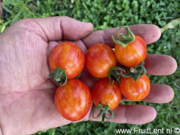 Het gaat om een ronde tot eivormige cherry- tot cocktailtomaat, geel gevlamd op een rode achtergrond. De vruchtjes hebben een vruchtgewicht van zo’n 15 tot 30 gram. Het vruchtvlees is goudkleurig en heeft een zoete smaak. Het vruchtvlees is echter wat melig en mist een lekker zuurtje. Daarom is dir ras wat ons betreft met name een toevoeging aan het aardappelziekte assortiment vanwege de spectaculaire kleurcombinatie. Voor de smaak zijn er betere te vinden. De eerste vruchtjes rijpen middelvroeg. Gerijpte vruchtjes zijn weinig gevoelig voor scheuren.
