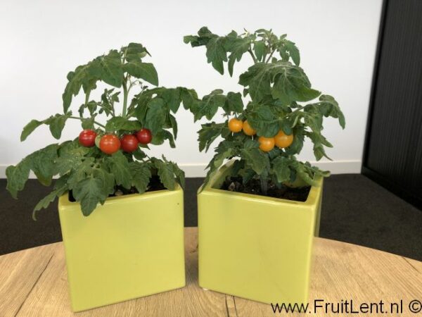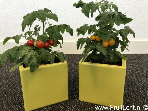 Dat de planten van de gele ‘Yellow Tom’ en de rode ‘Minibel’ er precies hetzelfde uit zien blijkt uit enkele bijgevoegde foto’s die we hebben gemaakt van planten die in 2020 op het werk op kantoor op de vensterbank stonden (met grote ramen op het zuiden).