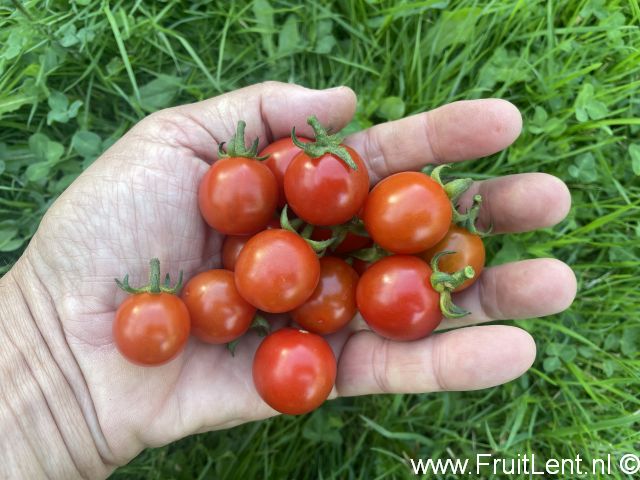 Het gaat om een rode cherrytomaat met met ronde glanzende vruchtjes van 6 tot 12 gram die in weinig tot licht vertakte trossen aan de plant hangen. Relatief kleine kroontjes die vrij vast aan de vruchtjes zitten. In het groene stadium zijn de vruchtjes licht gevlamd, maar vormen geen groenkragen. De rijpe vruchtjes zijn zeer stevig, weinig gevoelig voor scheuren en lang houdbaar. De knapperige vruchtjes hebben een zoete aromatische smaak met een laag zuurgehalte.