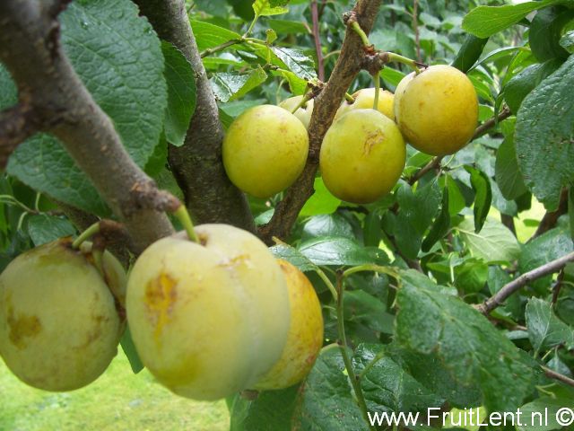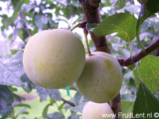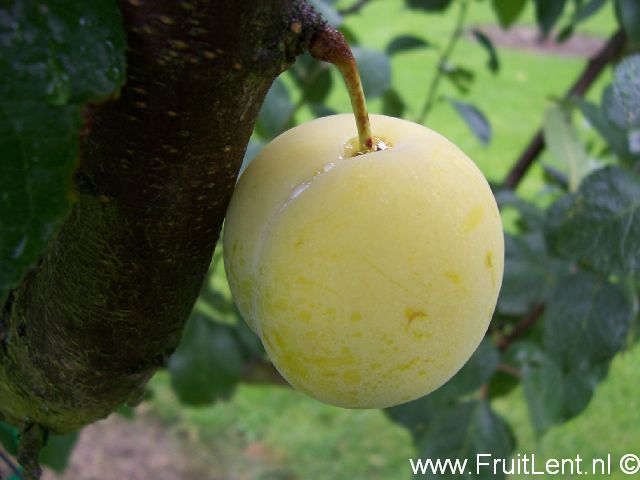 Geeft middelgrote tot tamelijk grote ronde groengele vruchten (55-60 gram) die in de eerste helft van augustus rijpen. Vruchten die in de volle zon hebben gehangen kleuren goudgeel met enkele rode stipjes. De vruchten hebben een tere schil en sappig vruchtvlees. Bij gunstige weersomstandigheden tijdens de rijping is de smaak uitstekend, namelijk zoet met een goed aroma dat enigszins verwijst naar de moederboom ‘Reine Claude verte’. Bij slechte weersomstandigheden kan de smaak meer flauwzoet zijn. De steen hecht matig aan het vruchtvlees. Zoals bij meer gele pruimen het geval is, zijn beschadigingen op de schil (bijvoorbeeld door schuurschade) goed zichtbaar. Ook verkleurt de schil na de oogst vrij snel bruin. Het vruchtvlees kan tijdens de oogst bij de steelaanhechting gemakkelijk inscheuren, waardoor de vruchten versneld kunnen gaan rotten. Dit is te voorkomen door de vruchten voorzichtig inclusief de steel te oogsten. Al met al is de houdbaarheid beperkt.