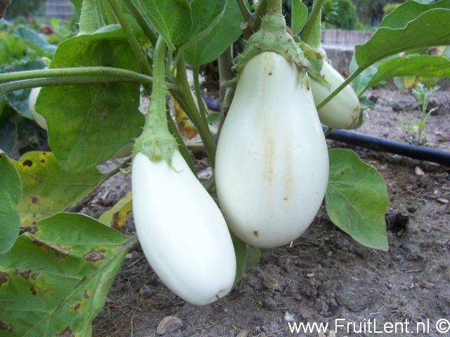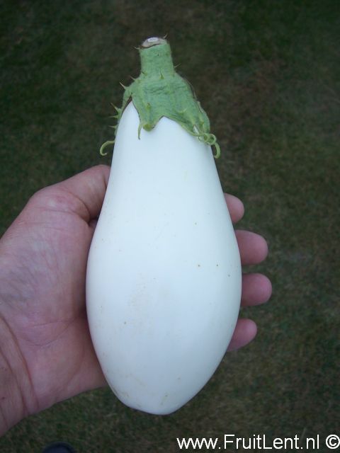 Dit ras geeft net als z’n voorganger ‘Cloud Nine’ halflange geheel witte vruchten, welke ik het geval van ‘White Lightening’ echter iets meer flesvormig van vorm zijn. Door de spierwitte kleur zijn de vruchten dus een bijzondere verschijning zijn ten opzichte van het gebruikelijke donkerpaars. De gemiddelde lengte-breedte verhouding van de vruchten is ongeveer 2,0.